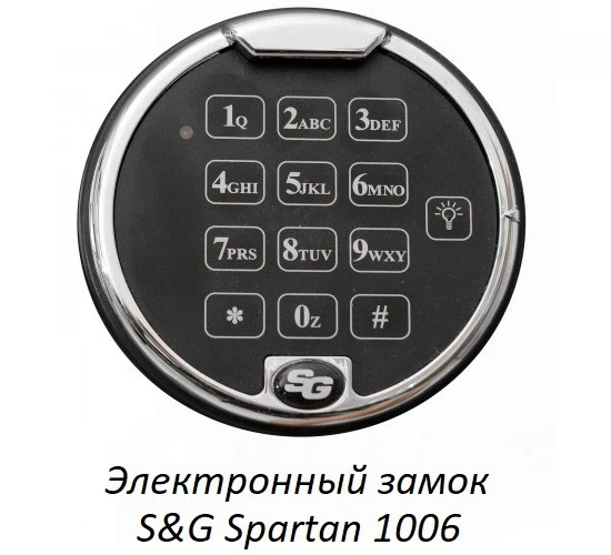 - На дверь установлен американский электронный замок Sargent&Greenleaf, обладающий сертификатами: VdS Class 2, UL Type 1, CEN B и т.д. Замок защищён от подбора кода и допускает до миллиона кодовых комбинаций.