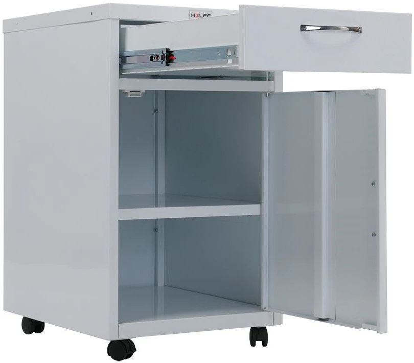 - В качестве дополнительной опции тумбу можно укомплектовать ключевым замком «Hilfe» (2000 комбинаций), а также пластиковыми опорами вместо колёс или резиновыми колёсами.
