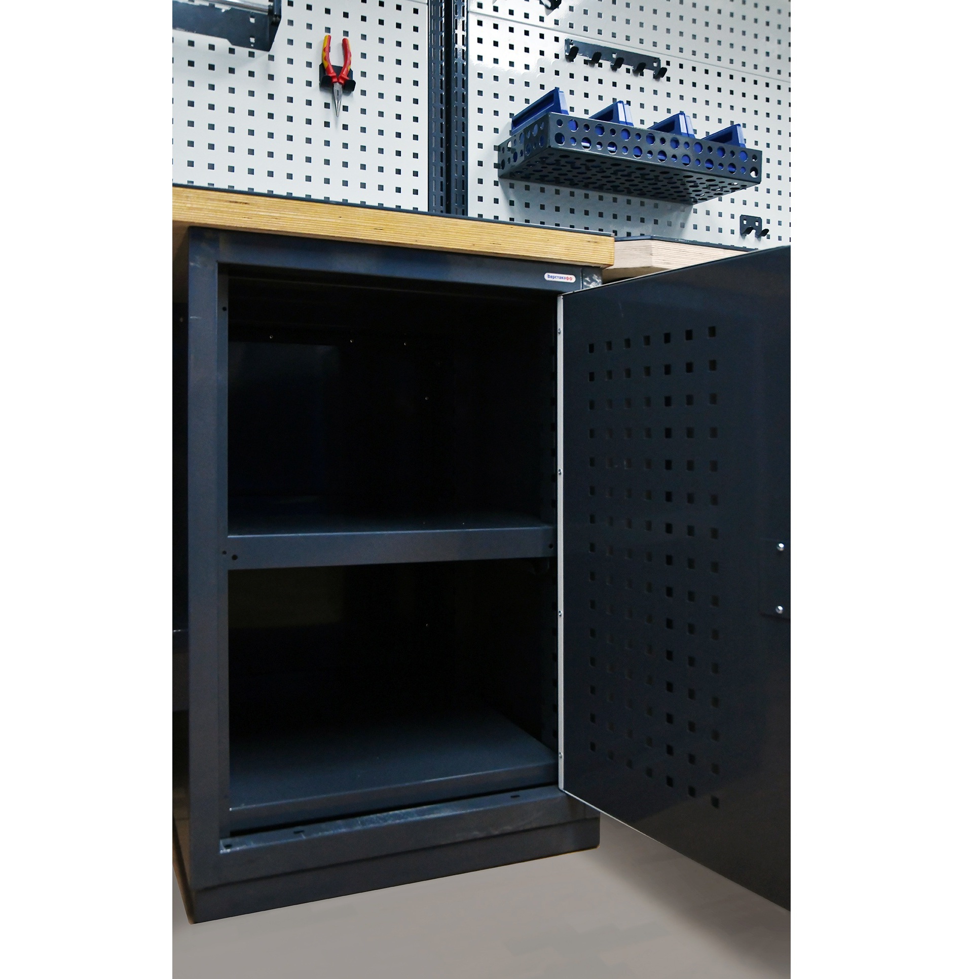 - Рабочее место комплектуется двойным перфорированным экраном, на котором удобно размещать держатели для инструментов, полки и другие навесные элементы, благодаря чему весь необходимый инвентарь всегда будет на виду.