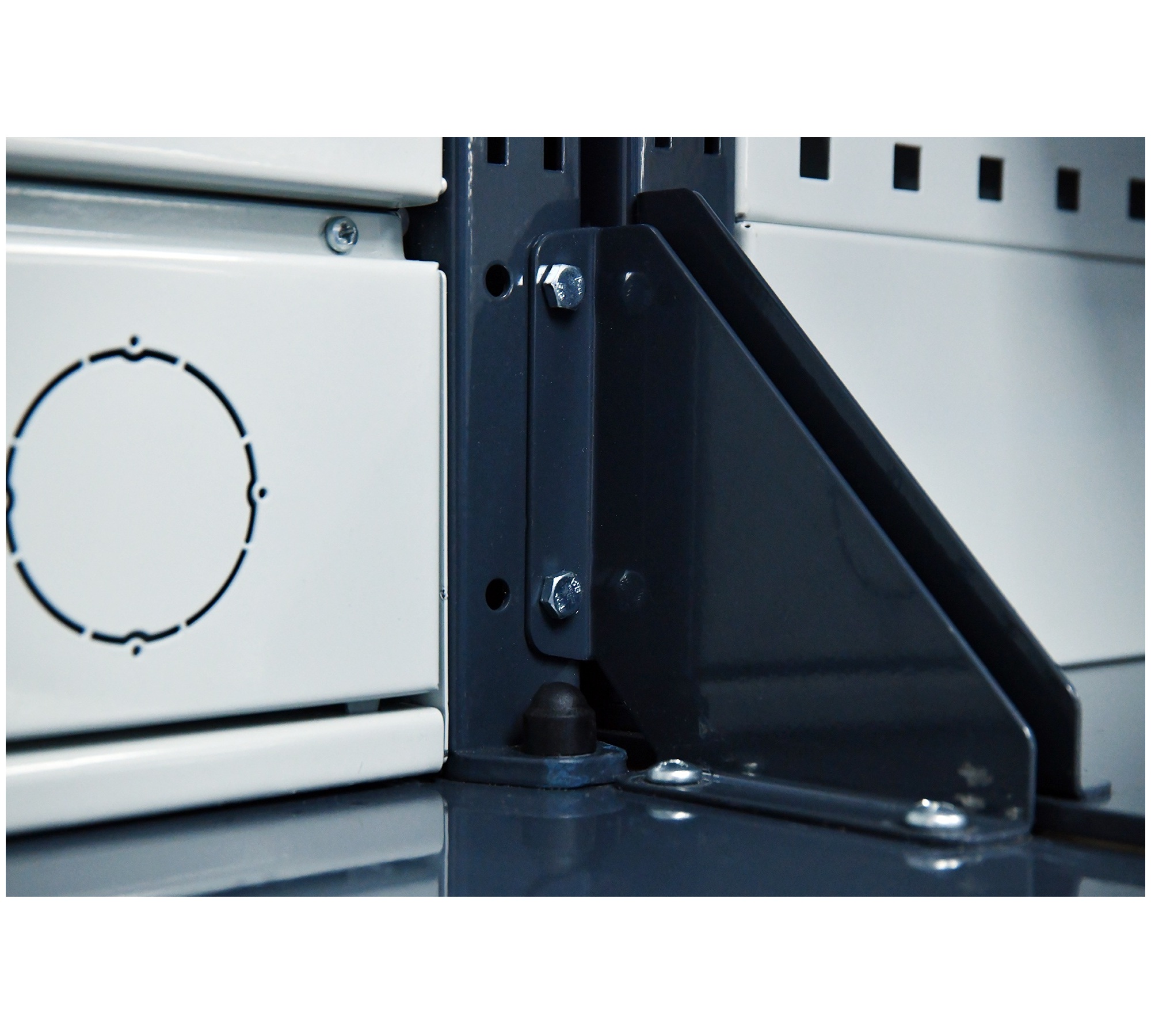 - Жёсткость конструкции усиливается комплектом «полка-стенка», который также создаёт дополнительное место для хранения крупного инструмента, оборудования и контейнеров с мелочами.